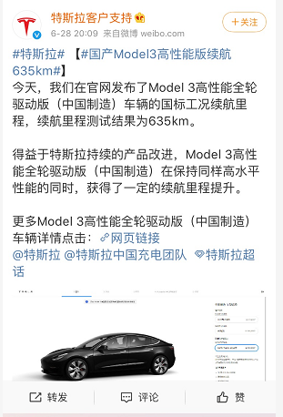特斯拉在其中国官方微博上公布了测试结果:“今天,我们在官网发布了Model 3高性能全轮驱动版(中国制造)车辆的国标工况续航里程,测试结果为635km。得益于特斯拉持续的产品改进,Model 3高性能全轮驱动版在保持同样高水平性能的同时,获得了一定的续航里程提升。”