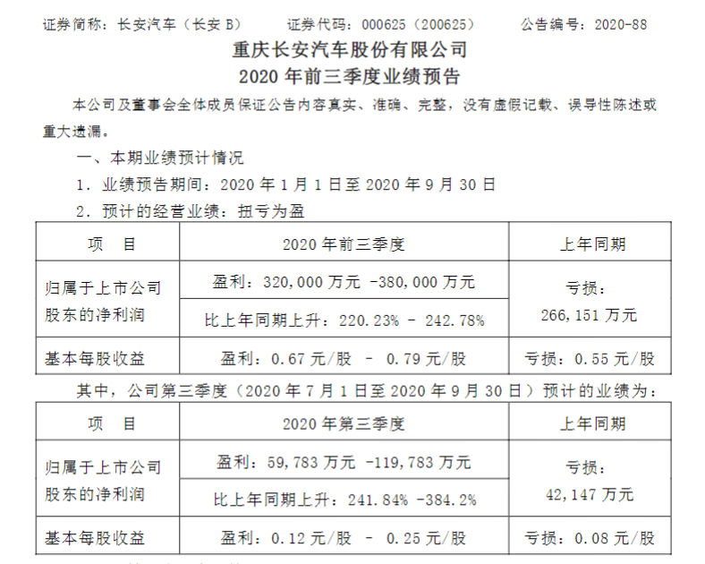 长安汽车前三季度预计净利为32-38亿元,同比扭亏为盈